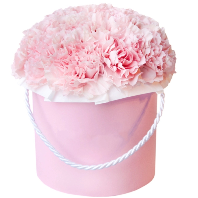 Букет состоит из 25 розовых гвоздик, коробка, оазис.