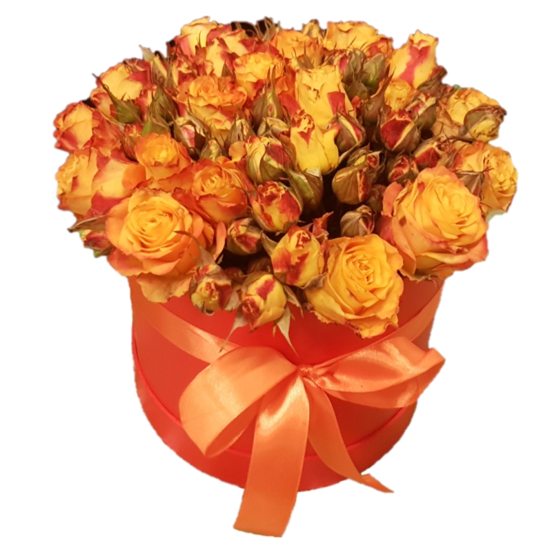 Букет состоит из 15 оранжевых роз, 7 веток кустовых роз, шляпная коробка, атласная лента.