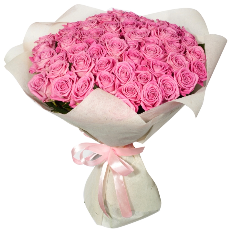 Букет состоит из 45 розовых роз, красивая упаковка, атласная лента.