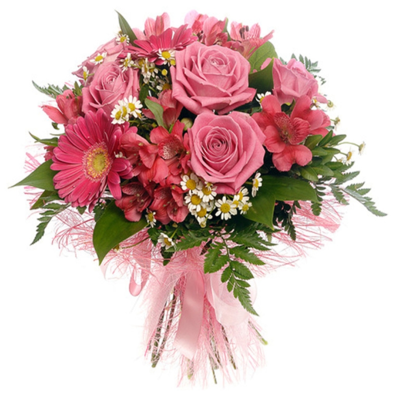 Букет состоит из 5 роз, 3 герберы, 6 альстромерий, 5 ромашек, зелень, красивая упаковка, атласная лента.
