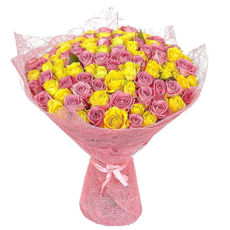 Букет состоит из 51 розовая роз, 50 желтых роз, красивая упаковка, атласная лента.