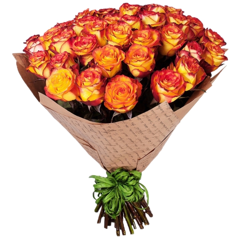 Букет состоит из 31 оранжевая роза, крафт, атласная лента.