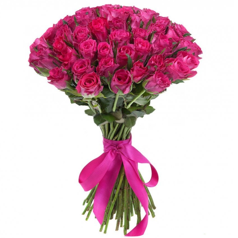 Букет состоит из 51 малиновая роза, зелень, прозрачная упаковка, атласная лента.