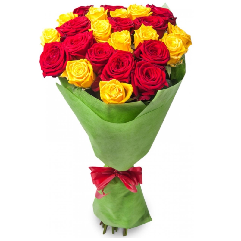 Букет состоит из 23 красные розы, 22 желтые розы, красивая упаковка, атласная лента.