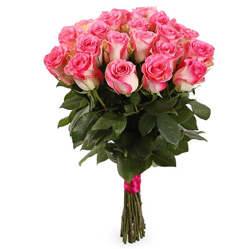 Букет состоит из 21 розовая роза, прозрачная упаковка, атласная лента.